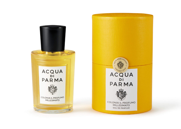 Le flacon en verre est orné d’un détail architectural embossé et d’une étiquette au dos mettant en valeur son savoir-faire et sa composition olfactive. Il est présenté dans la célèbre boîte à chapeau jaune d’Acqua di Parma, rehaussée d’un sceau doré commémorant la récolte 2024 et le 110e anniversaire de la maison.