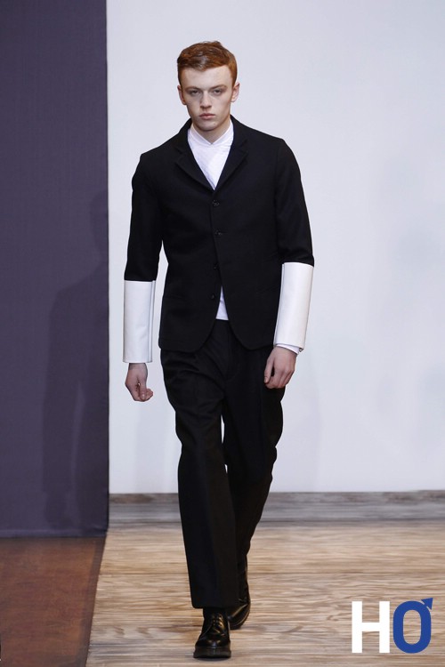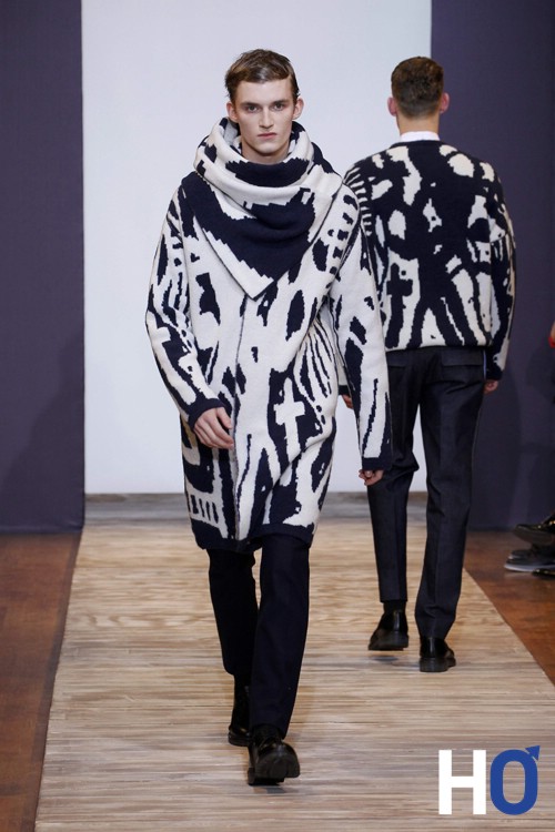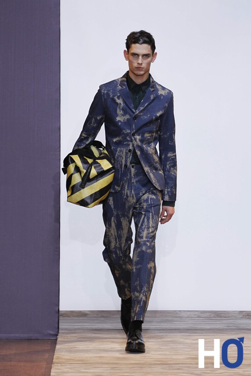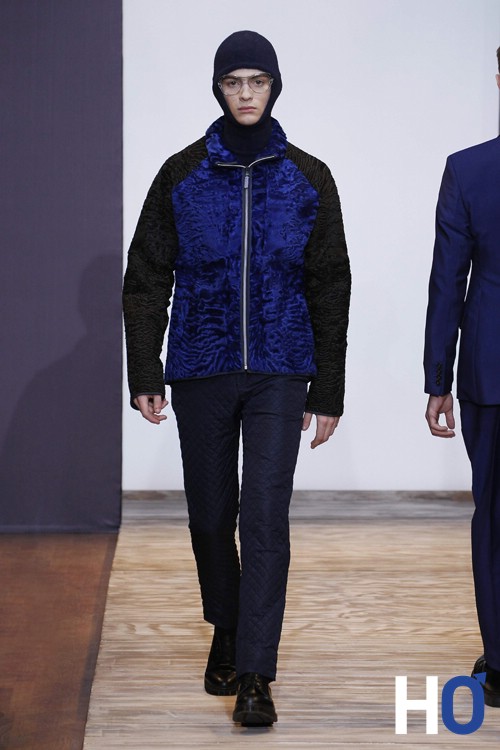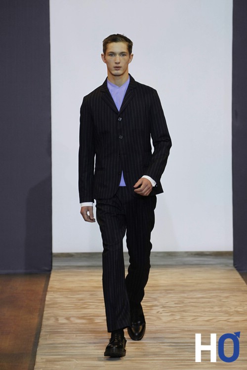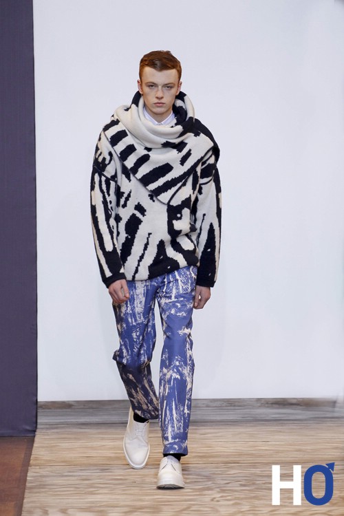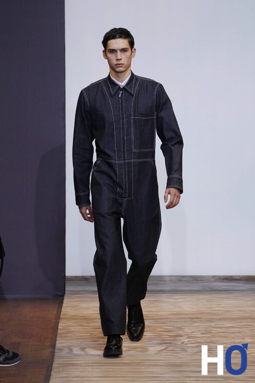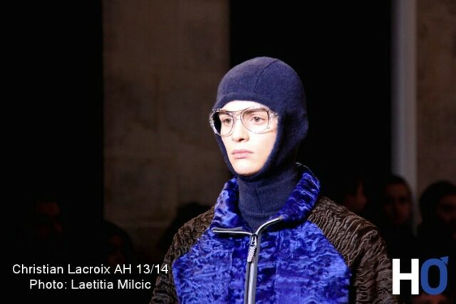 L’homme s’inspire du contemporain comme le montre certaines pièces de maille feutrée encre « expressions » Christian Lacroix ose le total look denim qui n’est pas si désagréable au final. La couleur principale de cette collection est le bleu que l’on retrouve aussi sur des pantalons en toile de mohair bleu-carbonne avec des sortes de tâches de peinture comme un bleu de travail (ce qui nous rappelle son inspiration pour l’art et l’architecture) Enfin, le noir et le blanc gardent une place considérable dans la collection notamment sur les dernières tenues du défilé ainsi que sur les chaussures. On notera les lunettes originales « protection » qui se situe sur certains looks donnant un aspect aviateur qui navigue entre le passé, le présent et le futur.