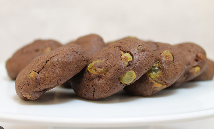 Couper le beurre en petits morceaux dans un récipient et le laisser se ramollir. Ajouter ensuite le miel et la cannelle. Bien mélanger avec une spatule. Quand tout cela est bien incorporé, ajouter l’œuf puis, peu à peu, la farine en pluie et le cacao amer. Bien égoutter les raisins et les ajouter. Mélanger jusqu’à ce que la pâte soit homogène.