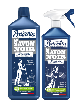 Briochin, leader national du savon noir avec 48 % de parts de marché, propose une gamme déclinée en deux formats pratiques : 1L et 750 ml. Sa formule, élaborée à 100 % à base d’huile de lin, garantit une efficacité redoutable contre les graisses tout en restant douce pour l’environnement.