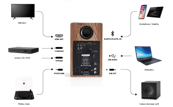 Entrées: Line In 1 (RCA)- Phono MM – HDMI ARC – Optical / Coaxial – Bluetooth 5.3 (AptX HD) – USB C Audio (Hi-Res 24 bits / 192 kHz)