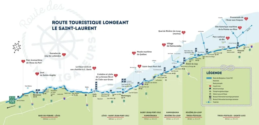 La Route des Navigateurs est un fabuleux itinéraire d’environ 470km qui suit la rive sud du Saint-Laurent, entre Centre-du-Québec et Bas-Saint-Laurent. Sentiers, marinas et points de vue longeant le fleuve s’enchaînent, offrant des panoramas impressionnants sur les eaux scintillantes, les charmants villages fluviaux et les plus beaux couchers de soleil. De Nicolet à Rivière-du-Loup, chaque escale célèbre le fleuve dans toute sa splendeur.