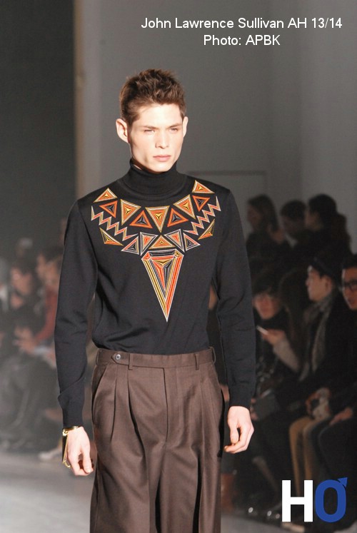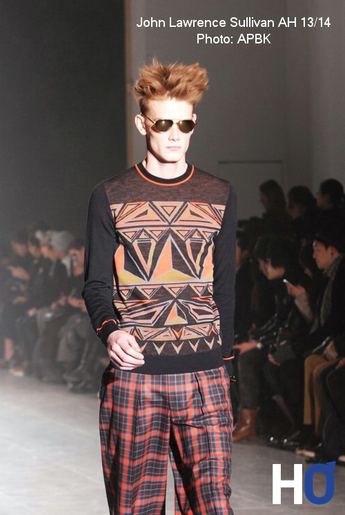 Élégantes et épurées, les silhouettes abordent ainsi fièrement une diversité tant aux niveaux des gammes de couleurs que des matières. Les Tweeds et les flanelles s’accompagnent ainsi très facilement de python ou de crocodile tandis que les oranges vifs habillent de dynamisme le corps. Le créateur ose même présenter un total look orange, preuve de l’importance de cette couleur pour la saison. Se dessine également sur la silhouette la géométrie du triangle, qui dans un objectif tribal se veut un élément fondateur et soucieusement contemporain. On le retrouve partout, aussi bien sous forme de graphismes tribaux que de colliers ou pochettes. Bien au delà de ces critères, l’influence même des imprimés floraux et des tartans mis au devant de la scène traduisent d’une élégance à toutes épreuves. Les pantalons tailles hautes en sont d’ailleurs un emblème porteur. Taillé dans une vision assez tailoriste, le vestiaire masculin s’ouvre cependant sur des déclinaisons plus décontractés osant même associer à un costume une paire de basket.