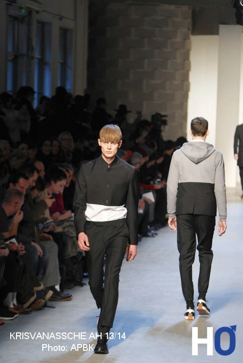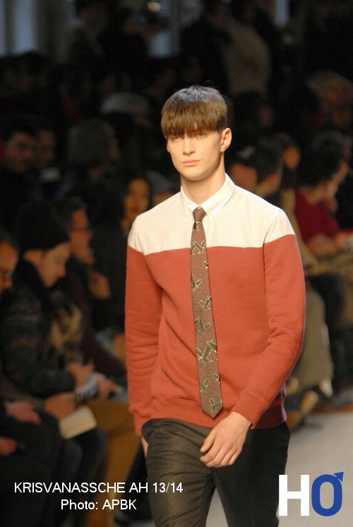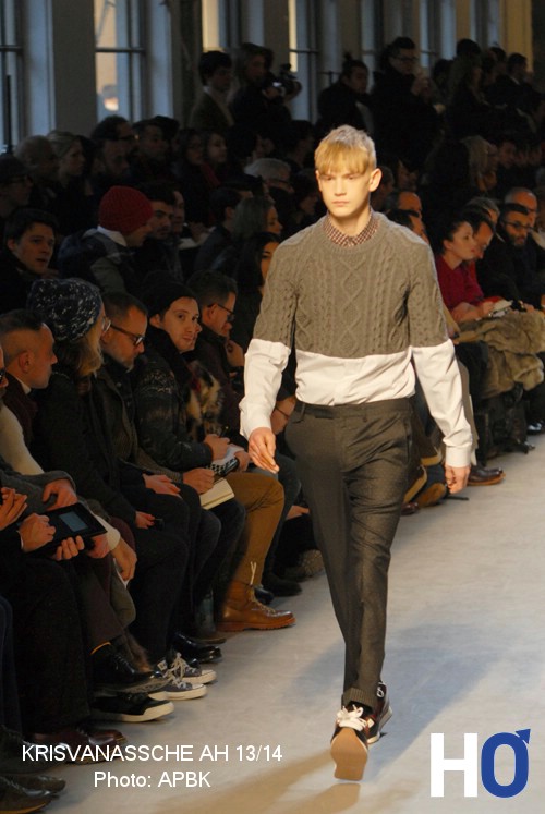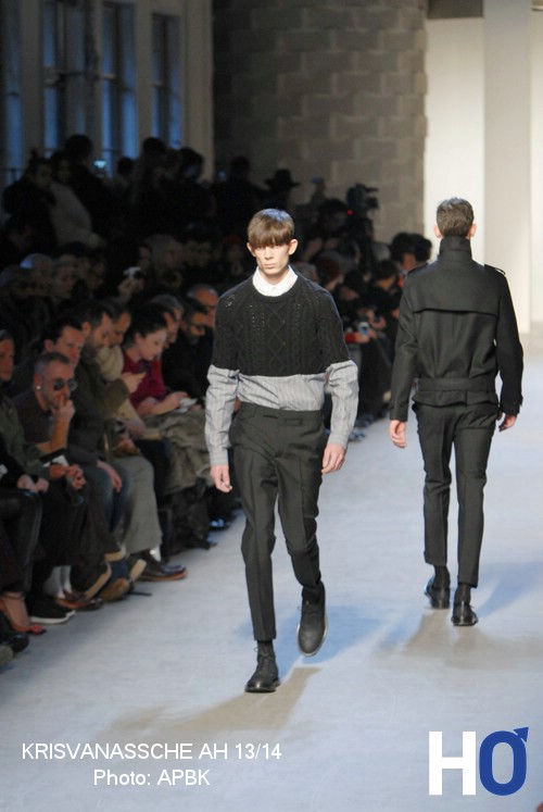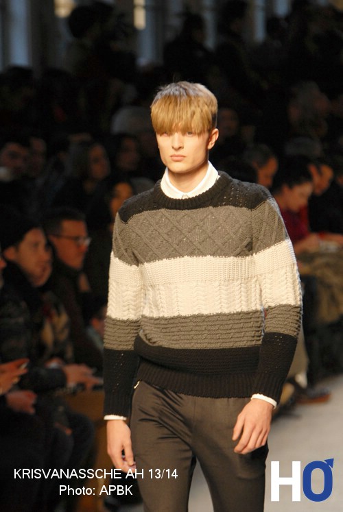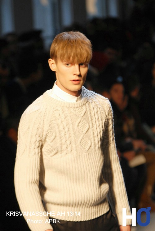 Des chandails en tricots à nervures croisées s’ajoutent à d’autres couchent de vêtements. Cet ensemble coordonné et délicat au niveau des matières souligne cette jeunesse que le créateur laisse volontairement paraître dans sa collection automne-hiver 2013-2014.