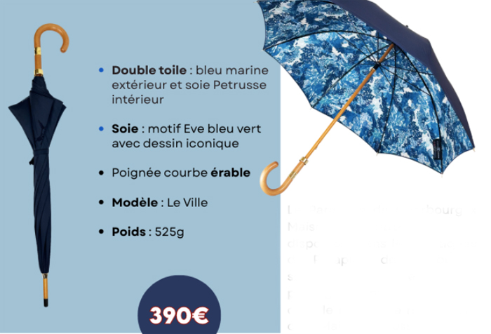 Imaginé par deux Maisons françaises partageant les mêmes valeurs : l’excellence artisanale, le respect de l’environnement et la passion pour la création. Ce Parapluie associe la solidité et l’allure du célèbre Parapluie de Cherbourg à l’univers artistique et coloré de Petrusse.