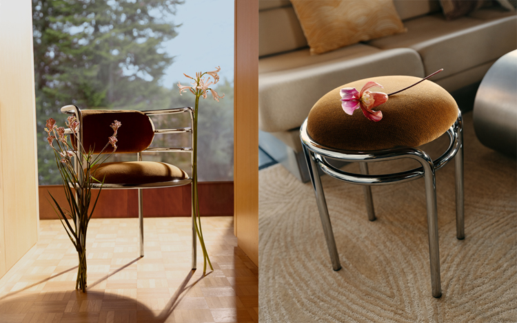 À l’instar de la pleine lune dans le ciel, la ligne Moon brille dans la maison. Ses tubes en métal renvoient une lumière d’argent et dessinent un cercle parfait qui inspire chaises et tabourets. C’est à un véritable ballet nocturne que se livrent ces fils de la lune. Ils déploient leurs pieds chromés pour habiter l’espace. Et apportent une touche cosy qui parfois semble venue d’une autre planète.