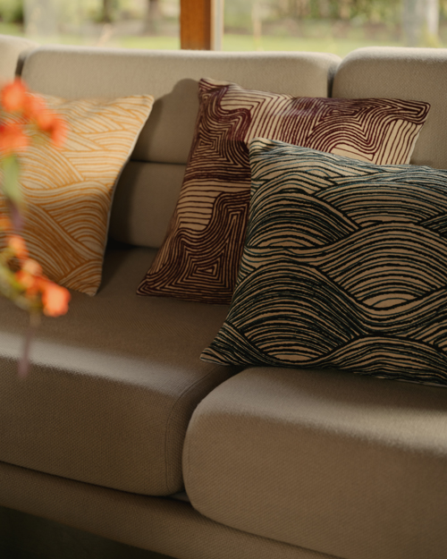 De leur côté, les coussins Onda et Houle unissent leurs forces pour tracer les contours d’un paysage intérieur tout en embruns et notes iodées. Grâce à la combinaison de deux techniques de broderie artisanale, le point zig-zag et le point plat épais, les motifs adoptent la formdes vagues et font déferler des ondes en relief qui épousent naturellement cette nouvelle cartographie intime.