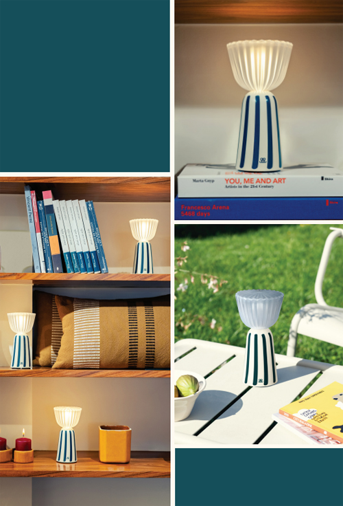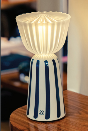 Printemps-Été 2026 de la lampe Swiing. Cette interprétation estivale se pare d’une base écru baignée de lumière, traversée de rayures Bleu