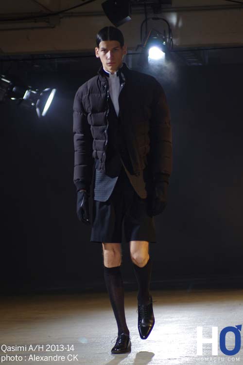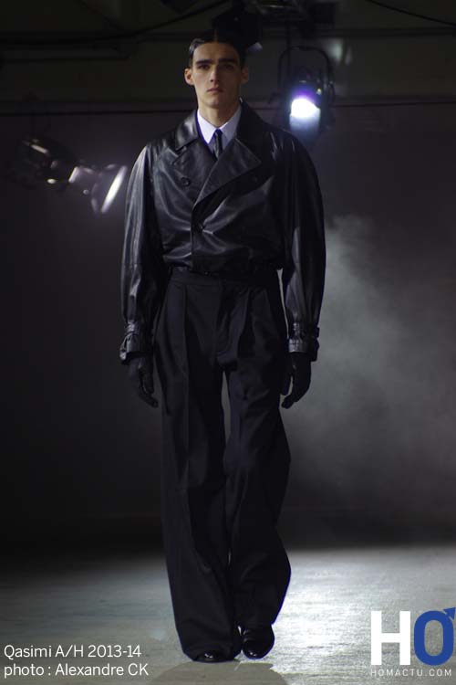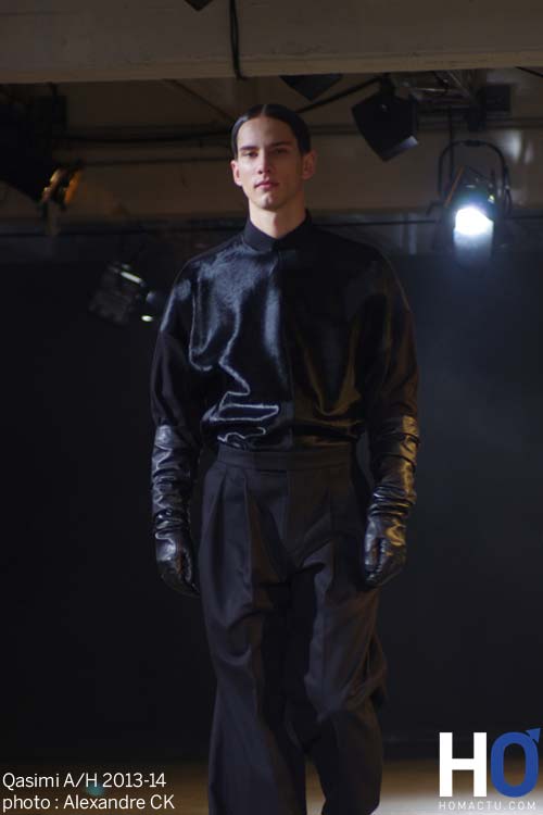 Les épaules surdimensionnées et les manches gonflées sur des jeux d’épaisseurs est ce que nous apprécions. Le jacquard en soie est utilisé sur certaines pièces. Ajouté à cette matière noble une autre qui l’est moins : le néoprène qui donne cette impression de gonflement sur certaines pièces ainsi que cet aspect luisant que l’on retrouve sur les coupes des mannequins. Les silhouettes semblent sortir de l’eau. Le cuir ainsi que quelques touches de peau de mouton subliment la collection. Le travail sur le néoprène n’est pas nouveau pour ce créateur qui l’avait auparavant utilisé dans sa précédente collection hivernale. Les pantalons sont majoritairement larges et portés en taille haute. Certains shorts plus ou moins longs apparaissent cassant cette idée qu’en hiver nous devons nous couvrir. Les manteaux sont longs. Les blousons sont courts et matelassés. La principale couleur de cette collection est le noir. A cela s’ajoute d’autres comme le bordeaux, le vert bouteille ou le chocolat.