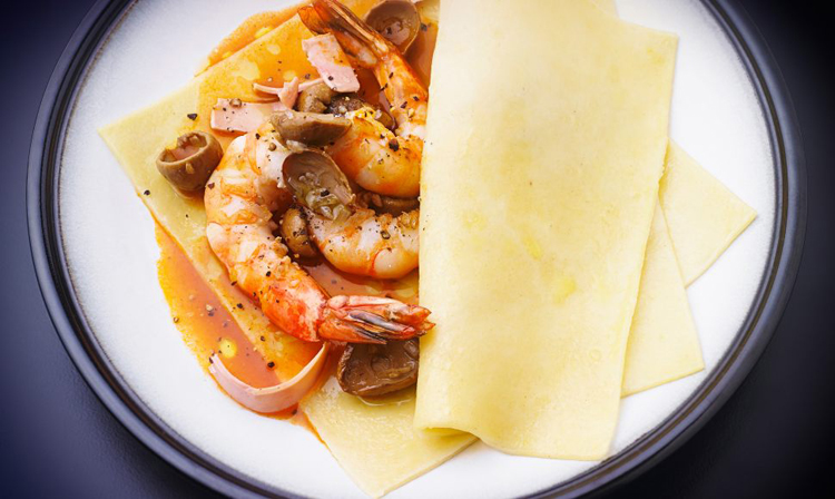 Ciseler l’échalote et la faire revenir dans une poêle avec un filet d’huile d’olive. Cuire les gambas à feu vif dans une poêle, saler et poivrer. Dans une assiette, disposer un carré de pâte à ravioles. Ajouter quelques gambas grillées, les cèpes, et des copeaux de foie gras. Recouvrir avec un deuxième carré de pâte à ravioles et napper de sauce de crustacés. Servir aussitôt.