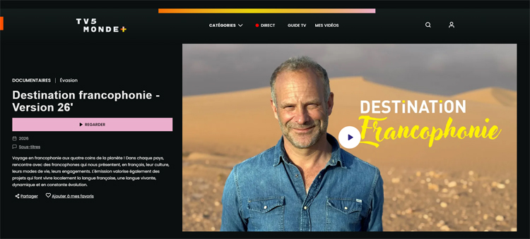 Voyage en francophonie aux quatre coins de la planète ! Dans chaque pays, rencontre avec des francophones qui nous présentent, en français, leur culture, leurs modes de vie, leurs engagements. L’émission valorise également des projets qui font vivre localement la langue française, une langue vivante, dynamique et en constante évolution.