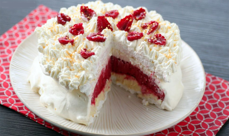Fouettez la crème fleurette avec le sucre à l’aide d’un batteur électrique jusqu’à obtention d’une chantilly. Sortez le vacherin du congélateur et recouvrez-le entièrement de crème chantilly, en lissant à l’aide d’une spatule. Décorez la surface avec un peu de crème et quelques framboises.